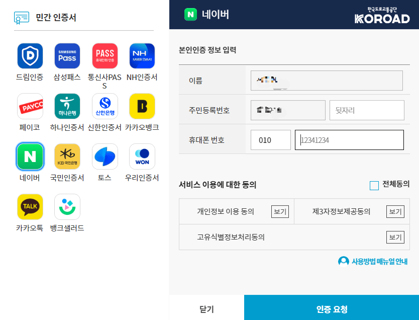 실명 인증후에 약관 동의 절차를 진행하시면 됩니다.