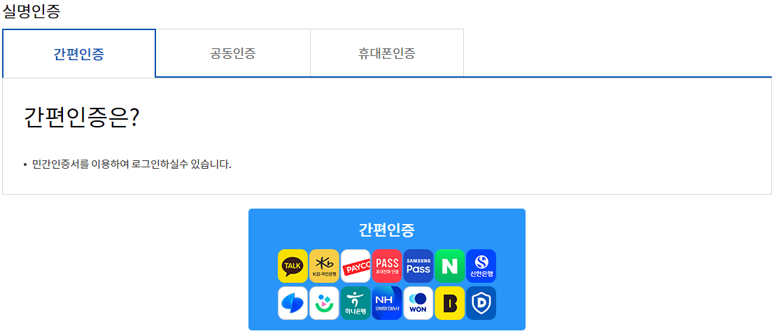 카카오톡, 네이버, 토스 등 간편인증을 통해 실명 인증을 하시면 됩니다.