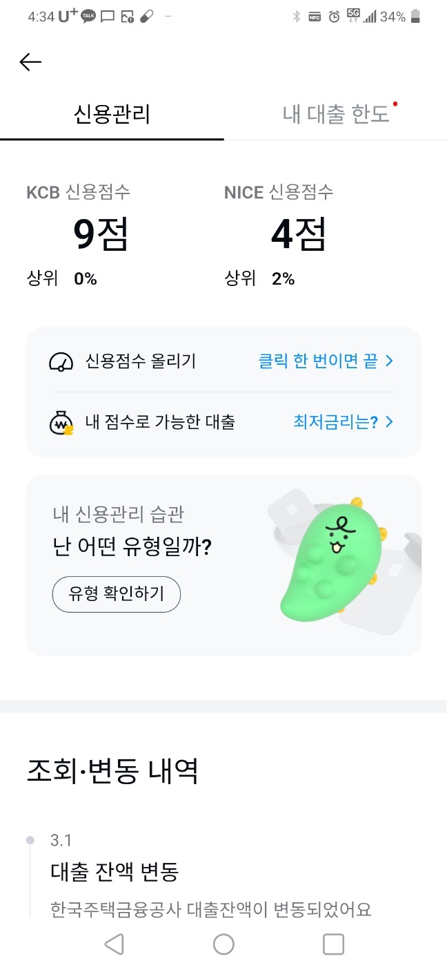 추가로 하단에서 신용점수 조회 및 변동 내용을 확인할 수 있습니다.