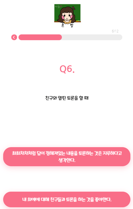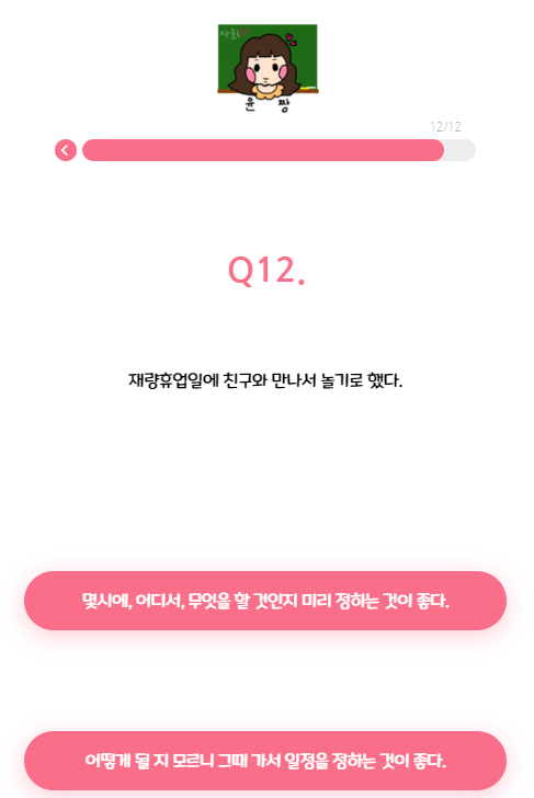 모든 질문을 선택하게 되면 결과에 따라 MBTI로 구분된 각 유형별 캐릭터가 나오게 됩니다.