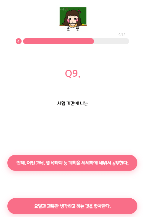 티니핑 테스트는 12가지 문항으로 구성되어 있으며 각 질문에 답에 따라 캐릭터와 MBTI를